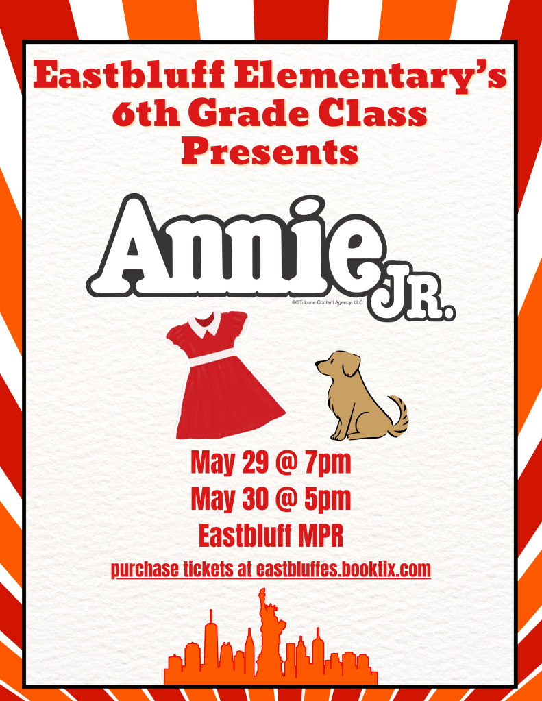 Eastbluff’s 6th grade class proudly presents Annie, Jr., a high-energy, heartwarming musical based on the popular comic strip and adapted from the Tony Award-winning Best Musical, with a beloved book and score by Tony Award winners, Thomas Meehan, Charles Strouse and Martin Charnin. Annie Jr. features everyone’s favorite little redhead in her very first adventure!
