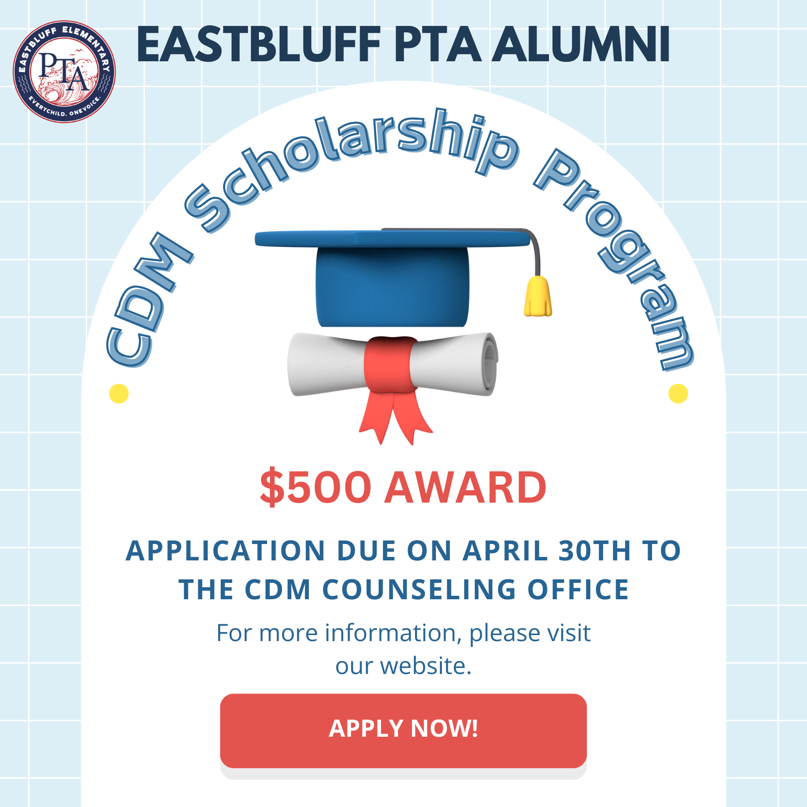 The Eastbluff PTA is proud to award one Eastbluff Elementary Alumni who will be graduating from CDM High School this year with a $500 Scholarship. The graduating student must have attended 6th grade at Eastbluff Elementary for the full school year. Click below for more detailed information and to apply. Applications are due on Wednesday, April 30th to the CDM Counseling Office. We wish you all good luck!