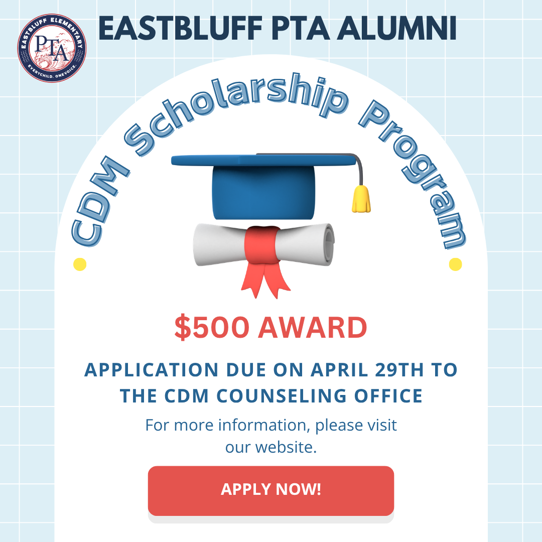 The Eastbluff PTA is proud to award one Eastbluff Elementary Alumni who will be graduating from CDM High School this year with a $500 Scholarship. The graduating student must have attended 6th grade at Eastbluff Elementary for the full school year. Click below for more detailed information and to apply. Applications are due on Wednesday, April 29th to the CDM Counseling Office. We wish you all good luck!