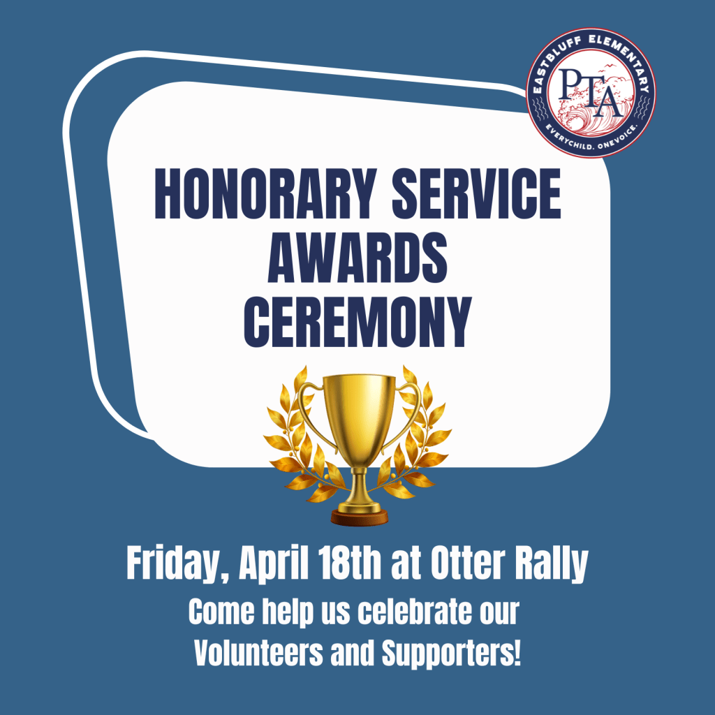 Do you know a teacher, administrator, parent, or volunteer who has gone above and beyond in their commitment to our Eastbluff PTA and school community? If so, please take the time to nominate them for an Eastbluff PTA Honorary Service Award. These awards are given every year to an individual or organization for outstanding service and contribution to our school community. The awards will be presented at Otter Rally on Friday, April 18th with a special celebratory luncheon in May. To nominate, please click HERE