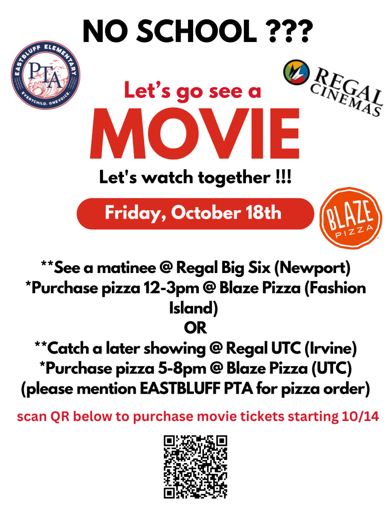 (Please mention EASTBLUFF PTA at Blaze Pizza to earn us money!)