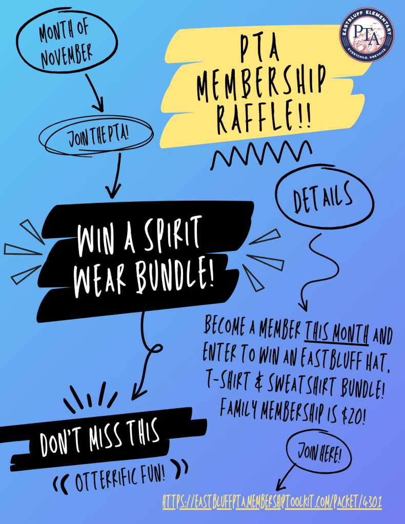 Join the PTA this Month and get automatically entered to win a spirit wear bundle including an Eastbluff Hat, T-shirt, and sweatshirt!