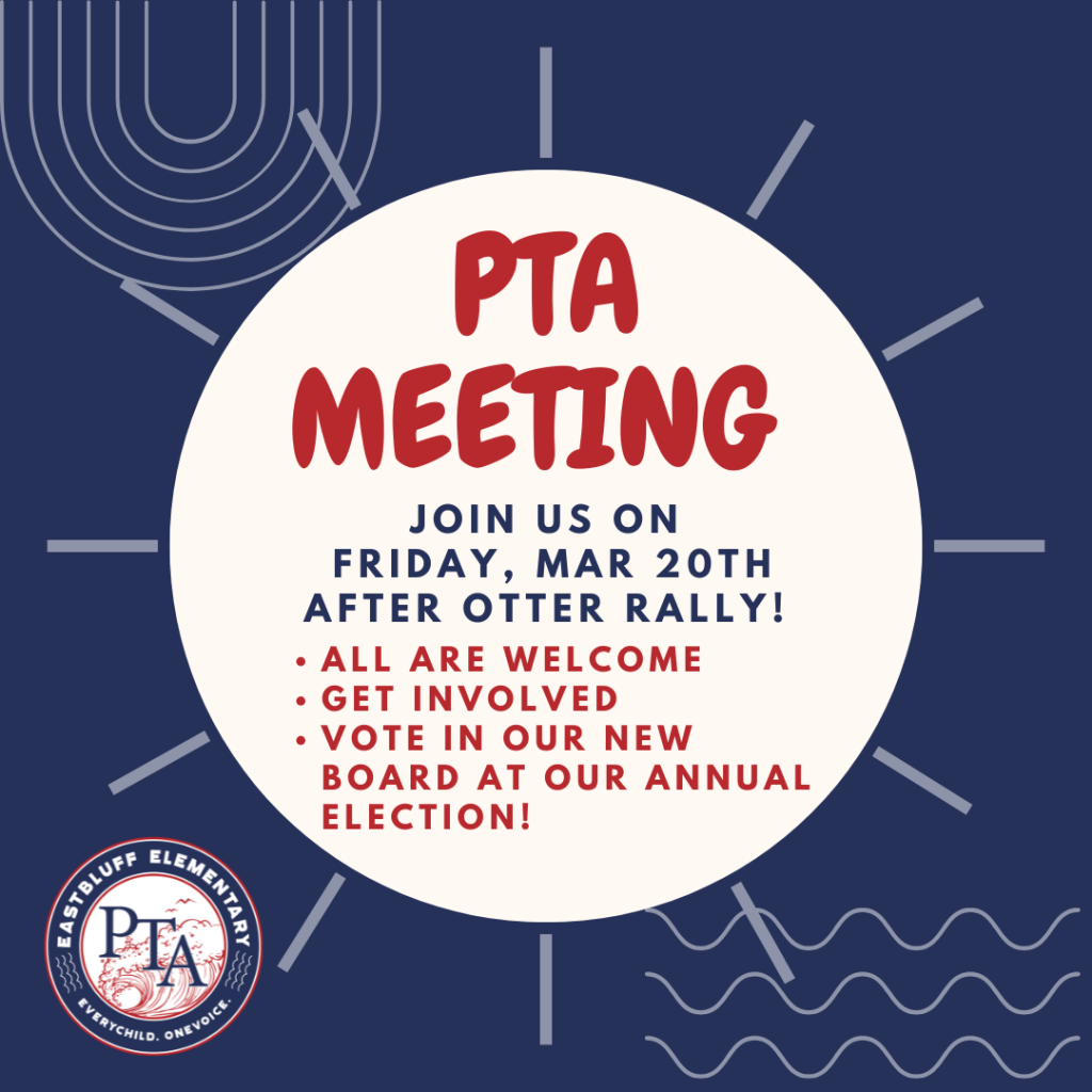 Join us for our next General PTA Meeting in the Teacher’s Lounge on Friday, March 20, immediately following Otter Rally. We will be holding our annual election and voting in the 2026/2027 board.