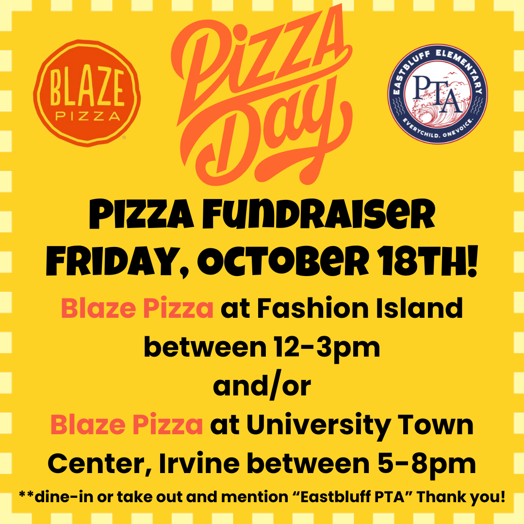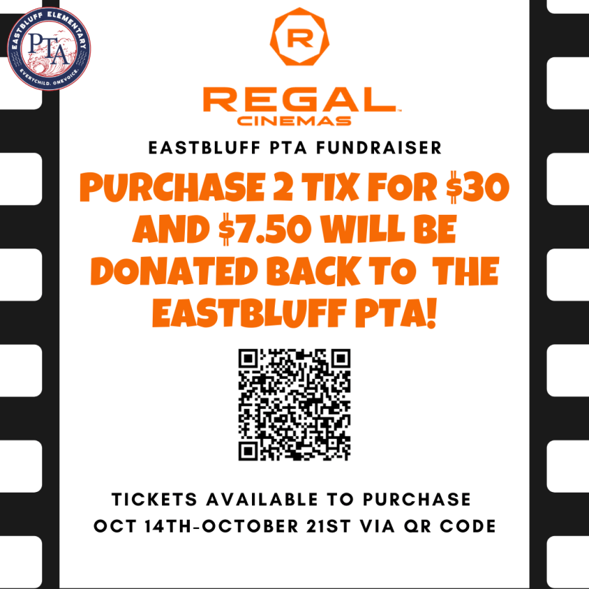 Purchase discounted ticket bundles and Regal Cinemas will donate back to the Eastbluff PTA! These movie tickets don’t expire so you can enjoy them in the future. Start by watching a movie this Friday, Oct. 18th at Regal Cinemas in Fashion Island or the University Town Center in Irvine before or after our Pizza Fundraiser at Blaze Pizza!