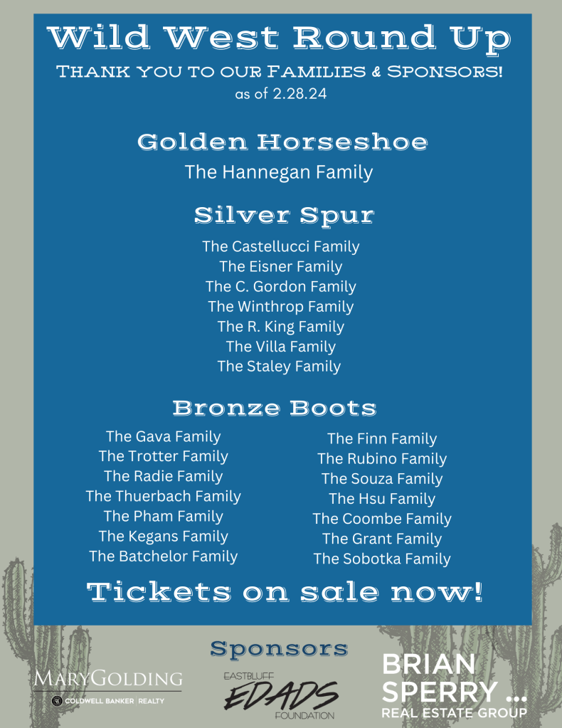 The 2024 gala theme is Wild West Round-Up: get ready for a rootin’ tootin’ time full of friends, western theme fun, and BIDDING! All proceeds from our annual spring gala directly fund art, STEAM, PE, science programs and teacher salaries, as well as other amazing PTA funded events/activities/special projects.