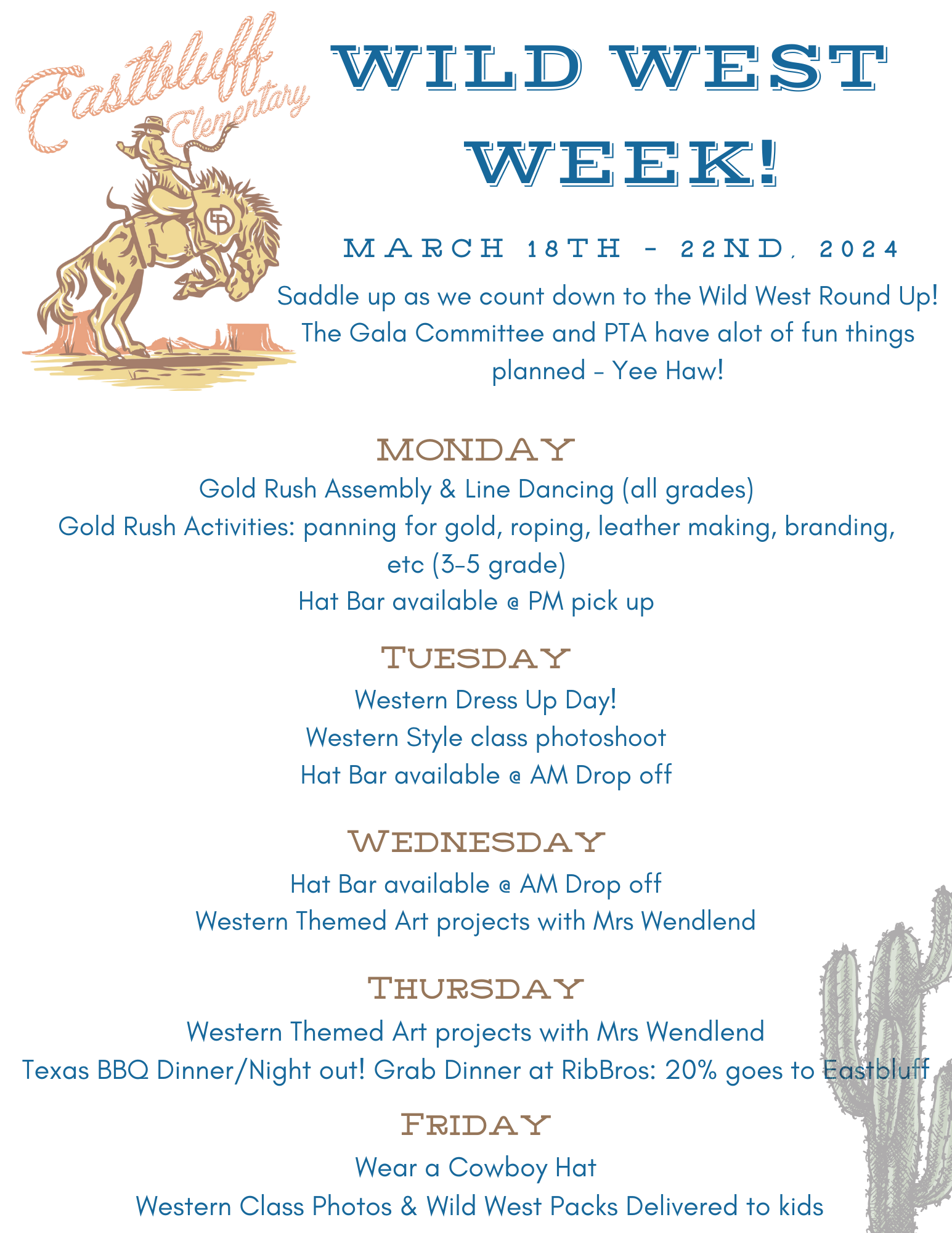 We have a very special assembly planned along with many wild west activities during the week including a Hat Bar! Click the link above to find out how to purchase a hat for you AND your student! (Hats must be purchased by 3/15)