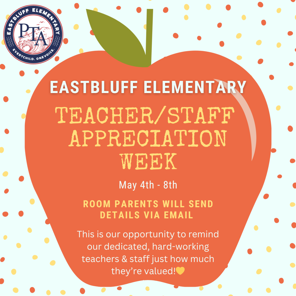 Let’s celebrate our awesome teachers and staff the week of May 4th – May 8th! Classes will have activities planned for the week for our wonderful teachers, so be on the lookout for updates from your room parents. Eastbluff PTA will also have something special planned for our teachers and staff this week, ending with a special luncheon on Friday- a celebration for all their hard work this entire year! Let’s show them how much we love and appreciate them!!